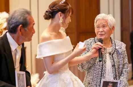ご披露宴中盤でご新婦様はお色直しに進まれます。エスコートに選ばれたのは、大好きなおじいちゃんとおばあちゃん。ご新婦様からお気持ちを伝えていただいた後に、おばあちゃんとおじいちゃんにも一言ずつお祝いの言葉をいただきました。目に涙を浮かべ、ご新婦様の目をしっかりと見ながらお伝えいただいている姿に会場全体が引き込まれ、涙されながら見守るゲストの方もいらっしゃいました。