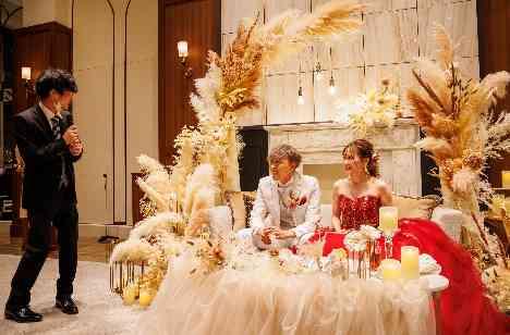 ゲストの皆様と過ごす時間を大切にされていたおふたりは、ご友人様に突撃インタビューをサプライズで行いました。1人目の方のインタビューが結ぶと、司会者が会場を練り歩き、次はだれか、だれかと会場全体で盛り上がることができました。 歓談のお時間をゆっくりと過ごされるだけではなく、メリハリのある演出でお楽しみいただきました。