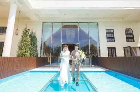 アーククラブ迎賓館広島ならではの水鏡をふんだんに使った退場シーン。 通常は会場内からの撮影ですが、外からの撮影をご希望いただいたので、カメラマンも外に回り込み撮影! チャペル内から手を振っていただくゲストの方と目が合う素敵な退場シーンになりました★ どんな天気でも綺麗に撮影できるヴィクトリアハウスのチャペルが映える写真になりました。