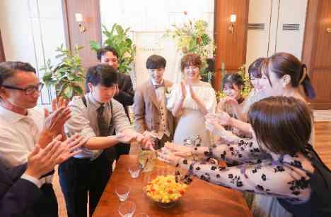 ゲストみなさまと一緒に創り上げる演出のひとつに、ウェディングケーキではなくカラフルな「フルーツポンチ」をご提案。 両手で抱えるほどのサイズの器に、大切なゲストの皆様からフルーツを入れていただきました。 最後に新郎新婦からシロップを注いで特製ドリンクの完成!デザートとして皆様にもご提供させていただきました。