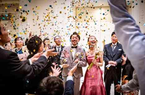 結びのセレモニーでは、小さな恋の歌をみんなで歌いながらオールスタンディングで退場致しました! 一体感を大切にしていたおふたりなので、ラストには「ゲスト全員で華やかに」とお打合せで決めました! さらに華やかさをプラスできるように、コンフェッティシャワーでおふたりの未来を祝福しました!結果として、今まで見たことのない一体感ある退場シーンとなりました!