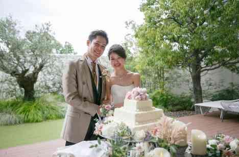 気候の良い時期だからこそガーデンを使って ケーキセレモニー☆座りっぱなしの披露宴ではなく ゲストも動いて自由に楽しめる披露宴となりました。 ウェディングケーキの周りにも卓さお花を飾って素敵に仕上げております☆
