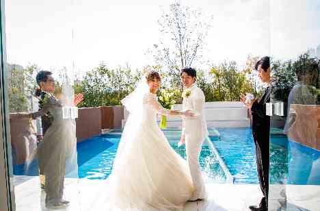 おふたりの未来を表している“水鏡バージンロード”に向かって退場します。おふたりの未来への扉を開けるのはご両家の親御様。今まで愛情をこめて見守ってきた我が子の道を親御様に開いていただく素敵なセレモニーです。