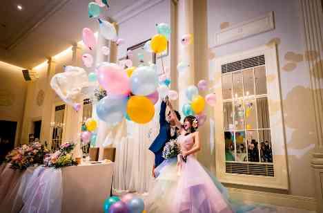 バルーンいっぱい使用したいという新婦様の想いを叶える大トリは【バルーンスパーク】です。カラフルなハート♡の形のバルーンがいっぱい入っている大きなバルーンをおふたりでスパークしました!!!迫力も満点! 好きな物、好きなことをつめ込みゲストの皆様も明るい気持ちになれるような演出を行う事ができました!!