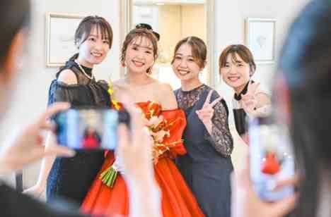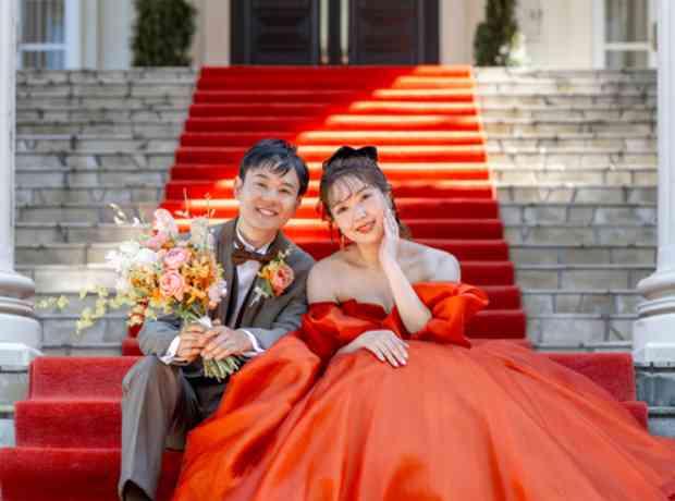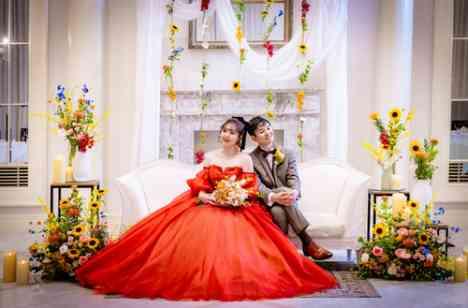 お打合せではお2人専属のフラワーコーディネーターと装飾や空間づくりのお話しを細かくさせていただきます。素敵なカラードレスの合わせて暖色系でまとめたお花達とお2人の後ろにはフラワーカーテンが♡お花がまるでふわふわと浮いているかのような装飾。可愛らしく柔らかい雰囲気のお2人ととっても合っていて、お2人らしさ溢れる装飾でした。