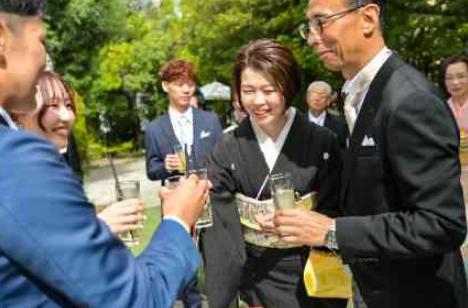 家族・親族のみの結婚式だからこそ、緊張せずに、アットホームな時間を過ごしたいとおっしゃていたおふたり。披露宴会場ではなく、挙式後ガーデンセレモニーの時間から、お酒やドリンクを片手に乾杯を行い、おふたりとゲスト全員がお話をしたり、写真をお撮りされたりするお時間をつくりました。この時間のおかげで、一気に緊張が解け、ゲストの温度感も上がっていき、よりアットホームな結婚式になりました。