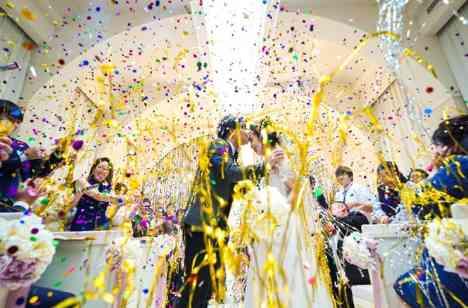 新郎新婦様が挙式退場時にバージンロードの真ん中まで進んでいただき、誓いのキスを行って頂きました。 キスの後にゲストの方にご協力をいただき、「おめでとう~」のコメントを添えてコンフェッティを行いました!