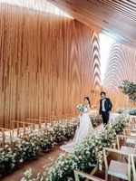 高さ14mの天井から自然光がたっぷりと降り注ぎ、木のあたたかみが感じられる設計の内装は落ち着いた雰囲気で挙式が行えると好評。
