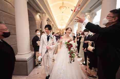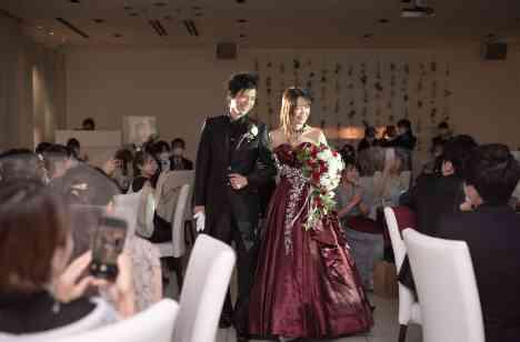 再入場の扉が開いた瞬間、ゲストの表情をみて、楽しんでくれていると実感しました。短い時間ではありましたが、こうしてまたみんなに顔を合わせることができて本当に幸せでした!白基調の披露宴会場に赤のドレスと黒のタキシードが最高にマッチしていたので、素敵な写真もとれてとても満足しています!ありがとうございました!