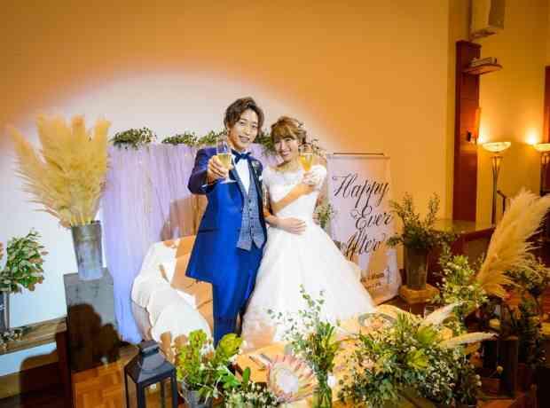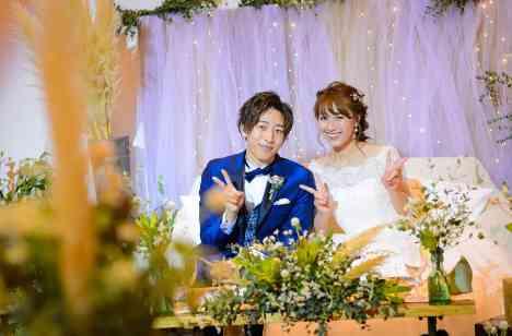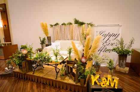 アットホームな雰囲気が良くて、高砂はゲストの皆さんと距離が近くなるようにソファーに。手作りのタペストリーやクッション、作ってもらったマーキーライトなどを飾っていただきました。ライトやチュールを使い、お花はあまり色気がなくシンプルな感じが良くて、、、お花屋さんにイメージを伝えて後はお任せしました!どんな感じになるかドキドキしていましたが、当日高砂を見て想像以上の可愛さに大満足でした♡!