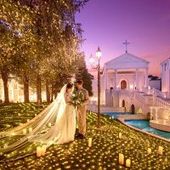 森に囲まれた大空間が魅力のアートグレイス フォレスト迎賓館。水に浮かぶチャペルと広い敷地に建つ3つの邸宅でおもてなしのパーティーを叶えて夕暮れ時にはテラスのイルミネーションがロマンチックな演出に