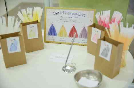とにかくゲストが楽しんでもらえる内容を考えてくださったおふたり。 受付時、早くお越しただいたゲストが暇をしないように、前撮りのお写真や、お色直しで着用するドレスの色当て用のペンライトをご準備いただきました。 貸切なので入口すぐのロビーにウェルカムグッズを設置!どの色のドレスを着られるかゲストも楽しみながらお待ちいただきます。