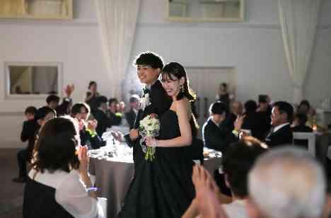 ご結婚式の為に伸ばした髪を、なんと普段美容師をされているご姉妹にカットしていただき、ゲストも驚きのヘアカットをしてのイメージチェンジ! ゲストは受付時に選んでいただいたサイリウムを披露宴会場で光らせ、ライブさながらの再入場! カラードレス色当てへの歓声と、ヘアカットへの歓声で披露宴も大盛り上がりでした。