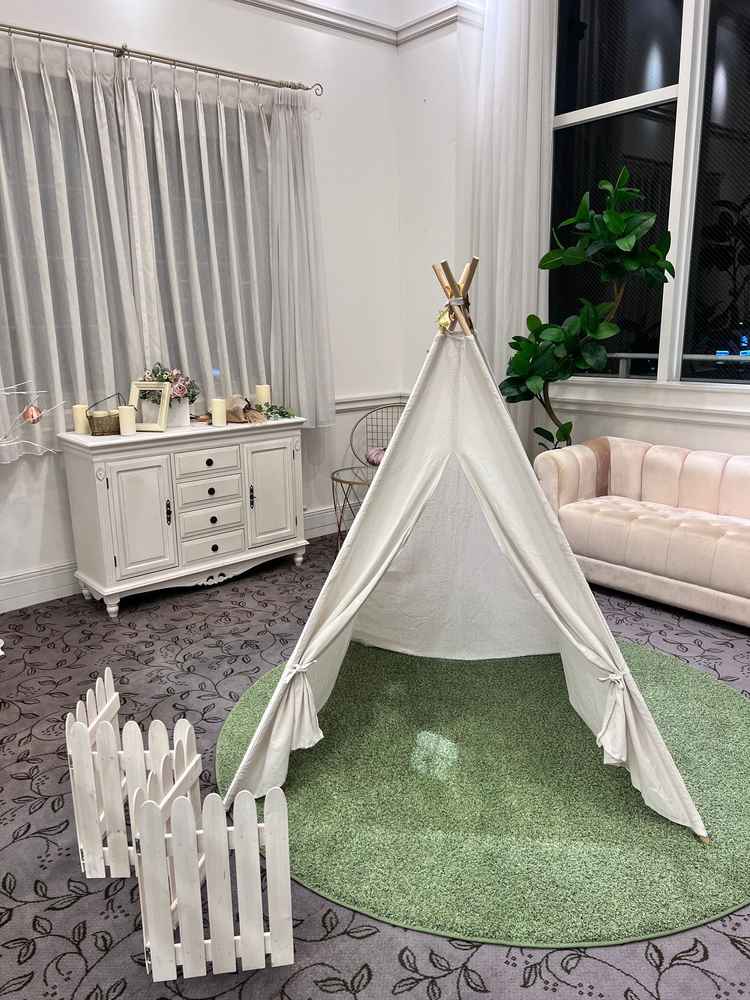 白をメインとした可愛らしさのある会場です。装飾や小物も充実していて、会場装飾を何も用意しなくてもある程度の完成度になりそうでした。