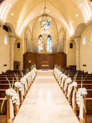 チャペル正面と、左右の壁にはキラキラ輝くステンドグラスが。 時間帯によって降り注ぐ光の位置が変わり、様々な表情がりとても幻想的な挙式を演出してくれます。