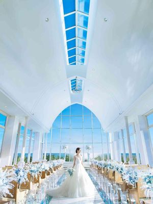 当館のコンセプトは「Voyage of Life」おふたりの結婚がスタートする特別な1日。航海をテーマとしたチャペルは海をモチーフとした青色が使われている。