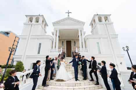 親御様との感動的な涙溢れるセレモニーの後は今度は笑顔溢れる時間をご提案!メリハリをつけることにより、ゲストもより楽しめる時間に。扉が開くと大きな鐘の音が街中に響き渡りフラワーシャワー!ゲストも結婚式のテーマである「笑顔」に。大階段でのフラワーシャワーはまるで海外ウエディングのようなシーンとなり、他では叶えられない演出です。