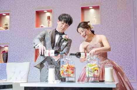 受付でゲストには瓶にメッセージを記入してもらいオリジナルの瓶が完成。 披露宴の前半で”夫婦円満の秘訣を教えて”というメッセージと共に選ばれた4種のフルーツ。 皆様にこれだと思うフルーツを入れてもらうことでオリジナルの果実酒が完成! ミックスジュースも一緒に作成したことでお越しのゲスト皆様にも振舞うことができました。
