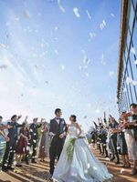 厳かな誓いの後には、ウッドデッキのテラスへと続く扉を開いて抜けるような青空のもとへ。皇居の水や緑、丸の内の風景を見晴らしながらゲストと感動をわかちあうフラワーシャワーは、生涯の想い出となることでしょう。
