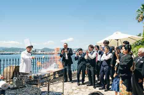 おふたりのおもてなしの思いはお料理でも感じてほしいとしっかり検討されての内容で振る舞われました。一番の見どころは海辺のテラスで新郎のフランベ演出です。リーベリアならではの空間で食欲をそそる香りとお肉の焼ける音にゲストの皆様を楽しませてくれたお料理タイムになりました。自由にお召し上がりいただきながら、テラスでのフォトタイムも海と空が広がる写真が残せます。