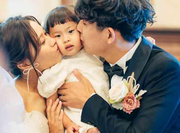 チャペル内での人前式はステンドグラスから自然なあたたかい光が差し込みアットホームな雰囲気で執り行われました。親御様との入場シーンにお子様のリングガールでご家族の絆を感じるあたたかい雰囲気となりました。結婚承認アイテムはリボンを使ったオリジナリティあふれるシーンとなり退場のおふたりのあふれる笑顔が印象的でした。