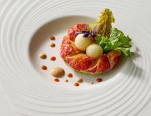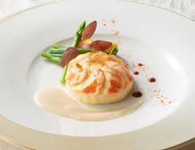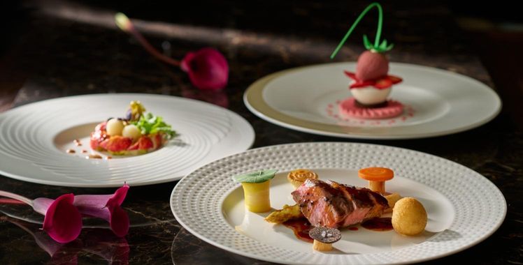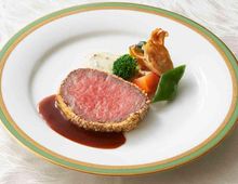 【スープ】3日間煮込んだ伝統のダブルコンソメ。味わう瞬間の香りを楽しんで 【魚】真鯛とロブスターのグラタン。ソースが絶品 【肉】和牛ロースの白胡麻風味。国賓や世界のVIPへのおもてなしで愛される一品 【デザート】人気No1の映えデザート 食前酒含む