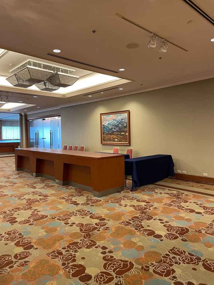 とても大きくてなんでもできそうな会場でした。四角いシャンデリアがあり豪華な印象を持ちました。格式が高い雰囲気だと感じました。