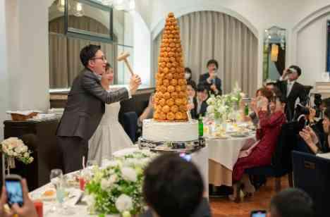 おふたりのウエディングケーキは フランスで生まれた「子孫繁栄を願う」と いう意味合いがある、クロカンブッシュを ご用意。 実は、新婦親御様のご結婚式のケーキも クロカンブッシュをご用意されていたそうで、 幼いころからの憧れで同じものをお選びいただきました。 こちらはナイフで入刀ではなく、小槌でクロカンブッシュを たたいていただきます!