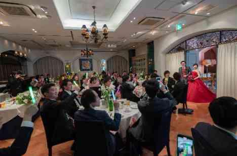 お色直し後の再入場はゲスト参加型の演出として サイリウムを振ってのカラードレス当て♡ ドレスの色が当たった方全員にはお菓子のプレゼントと、 当たった方の中でもじゃんけん大会を行いギフトカードをプレゼントされ 友人様だけではなく親族様も一緒になって参加してくださり会場に一体感が生まれました!