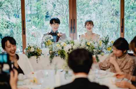 「挙式では、神聖なチャペルでふたりの誓いをしっかりと。その後のパーティはゲストと楽しむ時間にしたい」とお話いただいていたおふたり。パーティはレストラン「エトゥルスキ」をセレクト。大きな窓が特徴的なこの会場は、緑・自然光がおふたりを優しく照らし、写真にも綺麗に映り込む。座ったままでもゲストと会話ができるような距離の近さが魅力的。進行では、各卓ラウンドなどを取り入れ、笑顔溢れる時間を過ごされました。