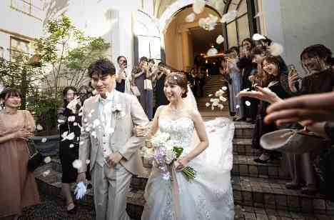 挙式ではリングボーイに指輪を運んでもらいました!大事に指輪を持って、一歩一歩進むかわいらしい姿に、チャペル内もあたたかい雰囲気に包まれました。挙式後のアフターセレモニーでは、ゲストからの「おめでとう!」の声とともにフラワーシャワーを。階段をおりる新婦様の長いトレーンがとっても印象的!おふたり一緒にブーケトスをしてゲストの皆様と楽しい時間を過ごしました。