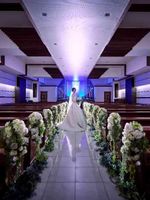 幻想的なサムシングブルーの光とダウンライトの温かな光に包まれて、幸せの時間の始まりを…光と音の演出がおふたりの挙式をより印象的に…