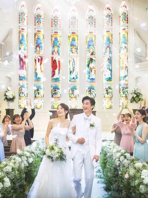 正面と両サイドに配されたステンドグラスから、温かな自然光が館内に注ぎ込みます。光と影が織りなす神聖な雰囲気の中で、唯一無二のウェディングが実現します。