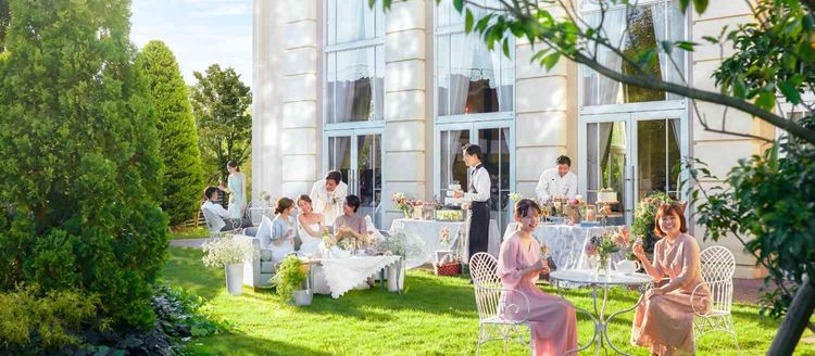 邸宅をまるごと貸切にできるから、ガーデンも自由自在に活用可能。人気のデザートビュッフェでゲストと語らったり、愛犬と一緒に写真撮影を楽しんだりと、ふたりらしいおもてなしが叶います。夜はライトアップされた幻想的な空間でナイトパーティーもおすすめ。五感で楽しむ贅沢なひとときをプレゼント