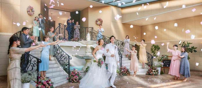 キラキラと輝く噴水の前で、ゲストからの温かな祝福を受ける感動のフラワーシャワー