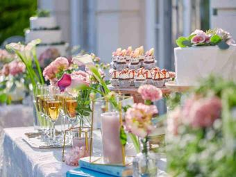 色鮮やかなスイーツが並ぶデザートビュッフェ。開放的なガーデンで笑顔あふれる会話を