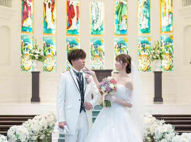 ステンドグラスが美しく輝く大聖堂は、王道の結婚式に憧れを抱いていた私達にぴったりでした。 「実際に見てみると思い描いていたイメージにぴったり。祭壇が高い位置にあるので、ゲストと顔を合わせて過ごせる空間が良かったです。また、スタッフさんの対応もとても良かったので、ここで叶えたいとこちらに決めました」。