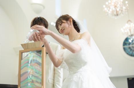 色鮮やかなステンドグラスや爽やかなブルーのバージンロードが印象的な大聖堂。「記念に残るものを残したい」と思い、ゲストも参加いただきみんなでつくるサンドセレモニーを取り入れました。 挙式のあとはゲストと一緒にバルーンリリース!またコスメブーケトスやカップ麺トスも行い、ゲストと楽しめる演出はみんなで楽しめました!
