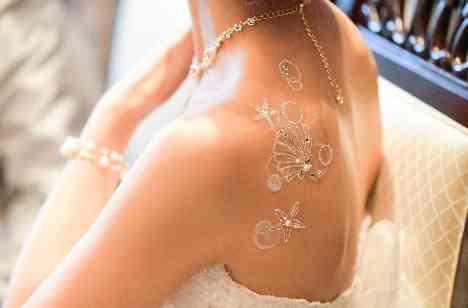ウエディングドレスを召して頂いたご新婦様の背中には貝殻やヒトデなどのマリンテイストなモチーフである「ボディシール」を… ウエディングドレスの純白に、パールやラメがあしらわれたボディシールが良く映えます(*^^*) 爽やかなマリンテイストのウエディングに合う、さりげないお洒落に、気づいたご友人様からは「かわいいね!」と嬉しい声が◎
