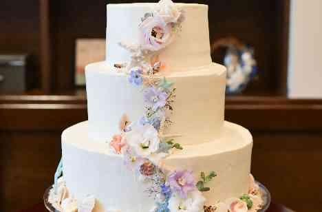 お洒落で可愛いウエディングケーキの登場! 真っ白な生クリームがきれいに塗られたウエディングケーキ ペールピンクやペールブルーなど、大人可愛いパステルカラーの花をあしらったウエディングケーキの足元には… お洒落なヒトデや貝殻などのアイテムが◎ プランナーやパティシエと相談して、世界に一つだけのウエディングケーキを仕上げました!