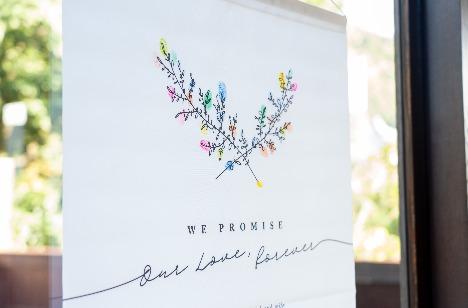 和装人前式の中で「新郎新婦がこれから連れ添い幸せな人生を歩んでいくこと」を証明する「結婚証明書」はとっても大切なアイテム◎ お二人からのアイデアで、そんな結婚証明書を「タペストリースタイル」のデザインに!! 挙式会場の水が流れるガラスの壁に飾りつけ、挙式ではそこにお二人の署名を… お家にもってかえってからもインテリアとしてとってもかわいい!