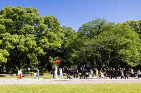 おふたりが選ばれた誓いのカタチは神前式。金華山のふもと、長良川に面した「岐阜護国神社」にて誓いを立てられました。斎主・巫女の先導のもと、本殿へ歩まれる花嫁行列では、皆様をあたたかな陽光が包み込む新緑の季節、ご家族・ご親族様に見守られながら大切な儀式を執り行いました。神社という厳かな雰囲気の中で、白無垢と紋付袴姿のおふたりの凛とした美しさが際立ちます。