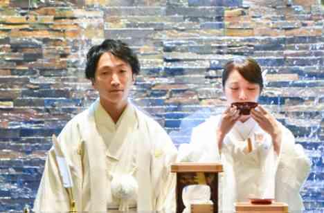 ご新郎ご新婦様が選ばれた挙式スタイルは「和装人前式」 ラ・ルーナピエーナのチャペルは和も洋も問わない やりたいを叶えられるつくりとなっております。 当日は誓いのキスでは無く"三々九度"で誓いを交わされました。 三々九度の大・中・小の盃には、それぞれご新郎ご新婦様の 「過去・現在・未来」の意味が込められております。