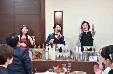 余興はバーテンダーによるパフォーマンス! おふたりの念願が叶った瞬間でした☆ご新郎様いきつけのバーの方に、目の前でオリジナルカクテルを作っていただきました。おふたりはもちろん、一緒に見ていたゲストの方も大盛り上がりなお時間でした。 最後は作っていただいたカクテルで、親御様とご新郎ご新婦様で乾杯🥂