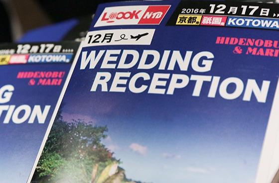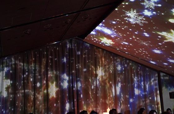 巨大スクリーンで映す、「ジャーニーウエディング」 →映像スタッフの方に、旅をイメージしたオープニング映像、プロフィールムービーを作っていただきました。 映すのは天井にある巨大スクリーン。同時に壁にも飛行機の映像を映してもらって、プロジェクションマッピングのように会場全体に旅のイメージを創り上げてもらいました。