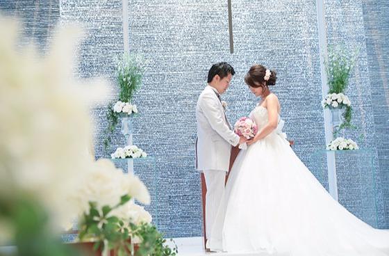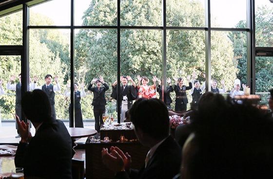 披露宴会場も、高砂のバックに見える緑が鮮やかです。 います。 水や緑といった自然と、落ち着いた建物の調和が私たちが求めていた優しさと高級感のイメージにぴったりでした。