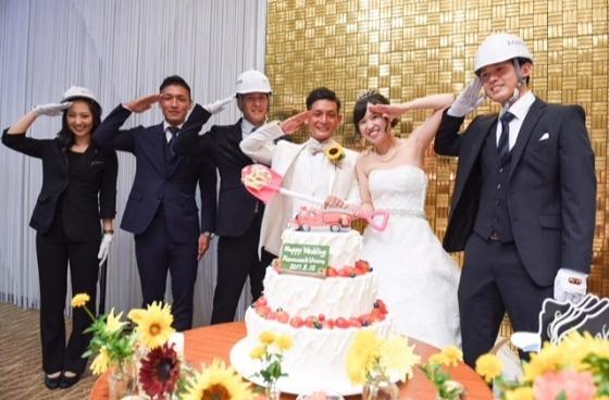 ファーストバイトでは夫が消防士ということもあり、消防の友達、担当プランナーさんに参加していただき、「腑抜けの新郎を救助する」という演出で、スコップでファーストバイトをしました。