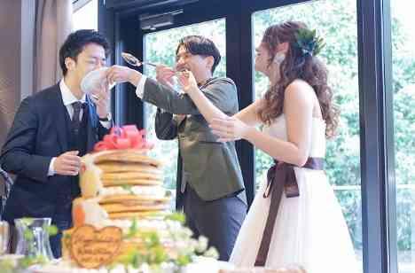ウェディングケーキです! 打ち合わせで「こんなんしてみたい〜」と何気なく候補に上げた1つでしたが、まっすーも気に入ってくださり、実現することができました。 ウェディングケーキ1つでも、私達の細かい要望を聞いてくださり、イメージ通りの可愛らしいケーキでした! 当日は特大のスプーンで新郎へファーストバイトをしました!お世話になったまっすーへもサプライズでサンクスバイトを♡