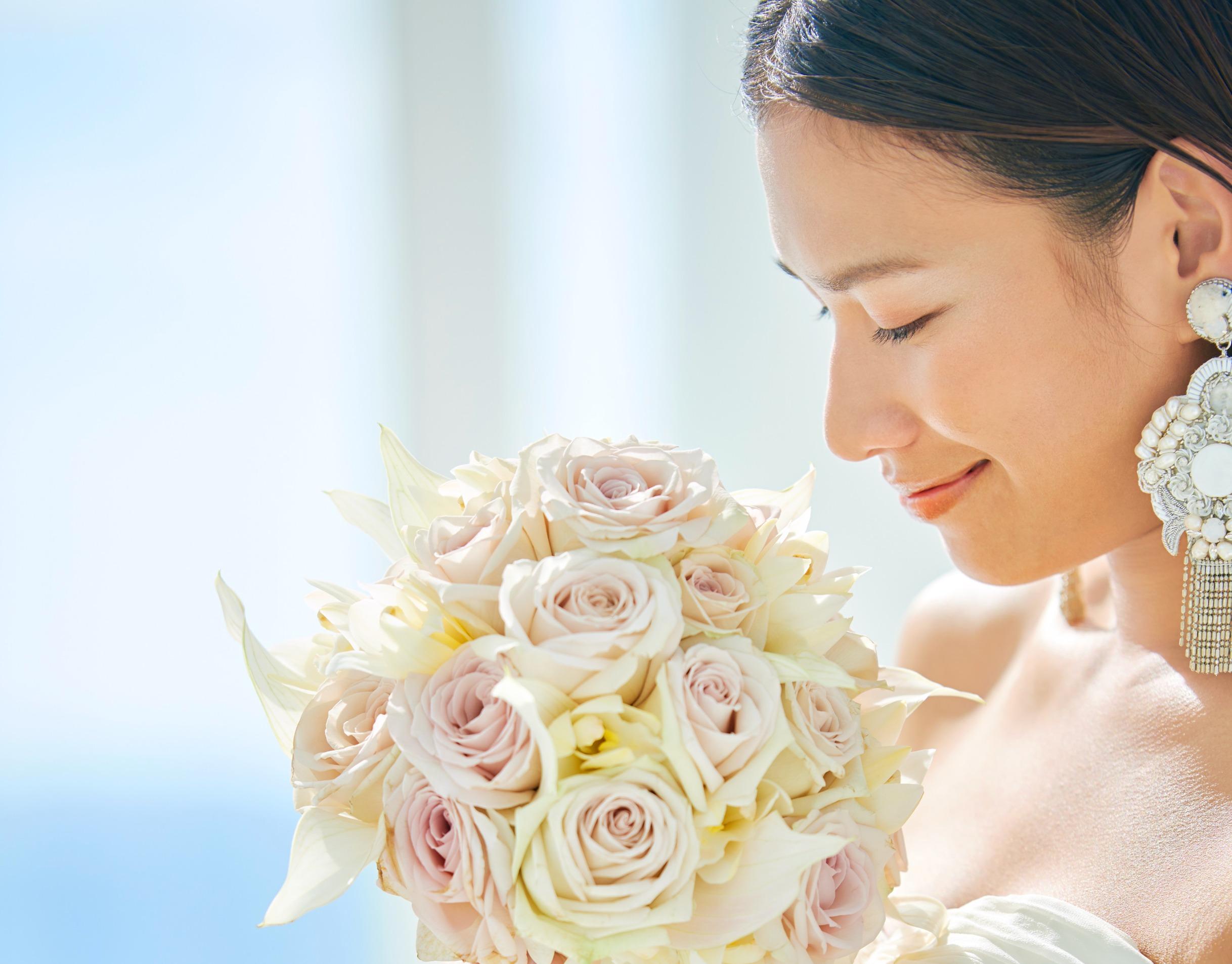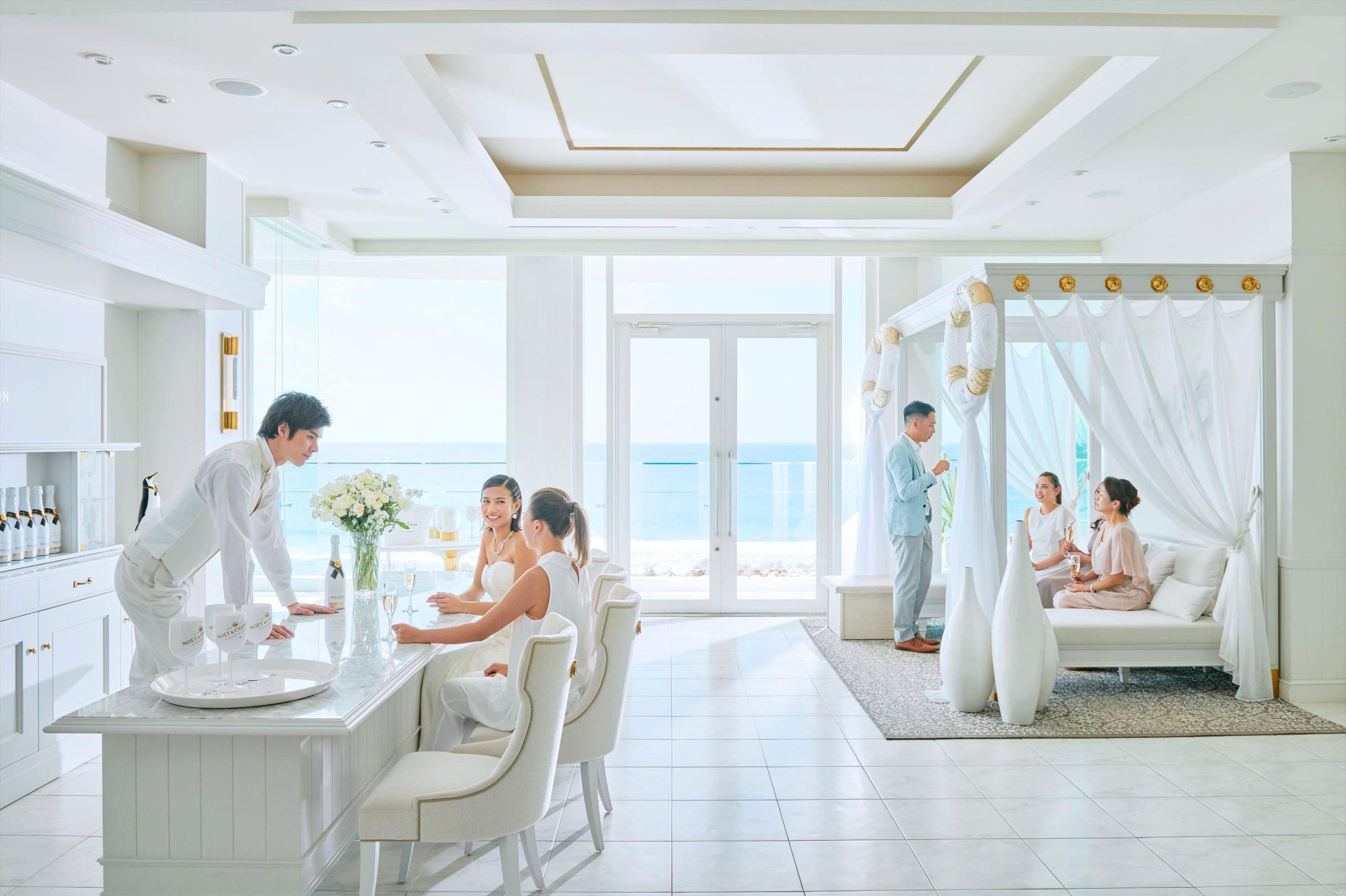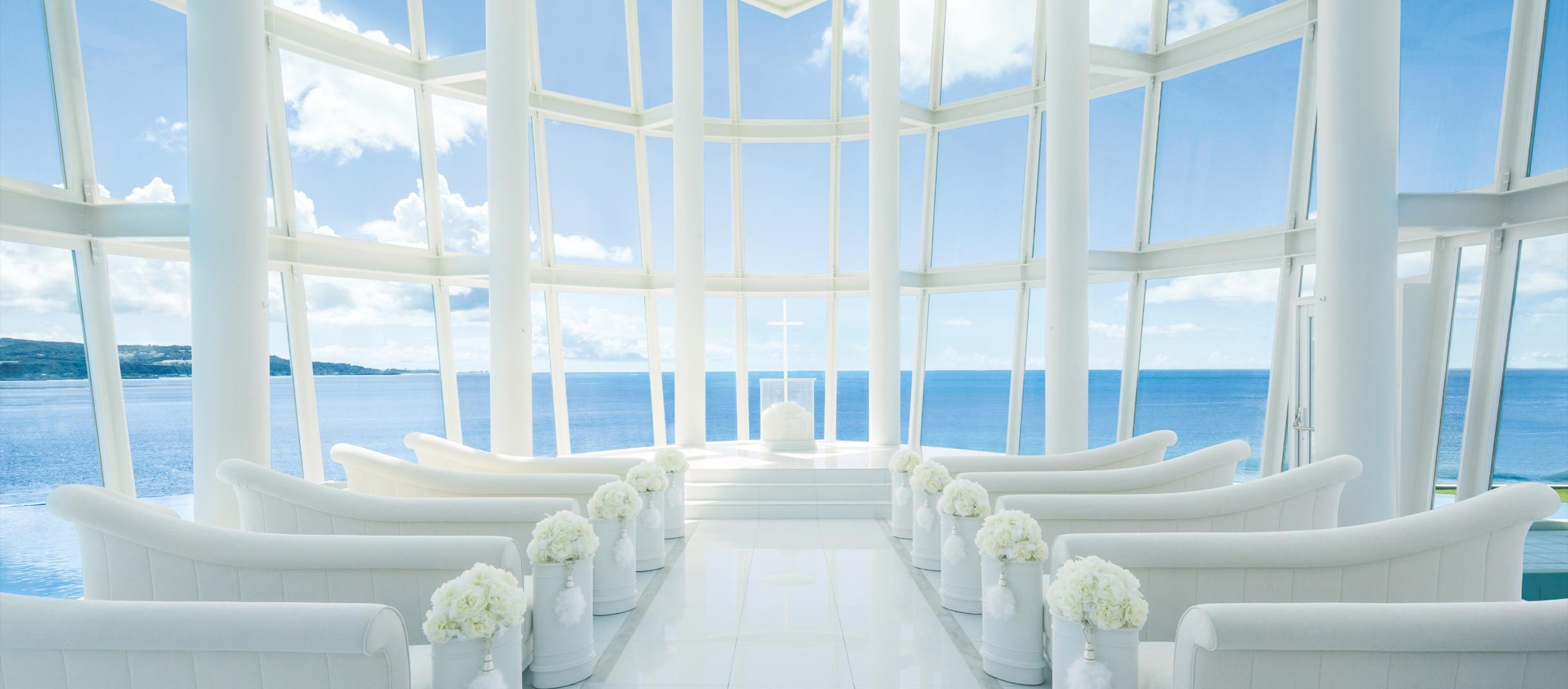 ピュアホワイトのチャペル空間が、広がる海と空のパノラマを美しく際立たせます。白と青のコントラストが描く光景は、真新しい世界へと踏み出すおふたりにふさわしい始まりのステージです。