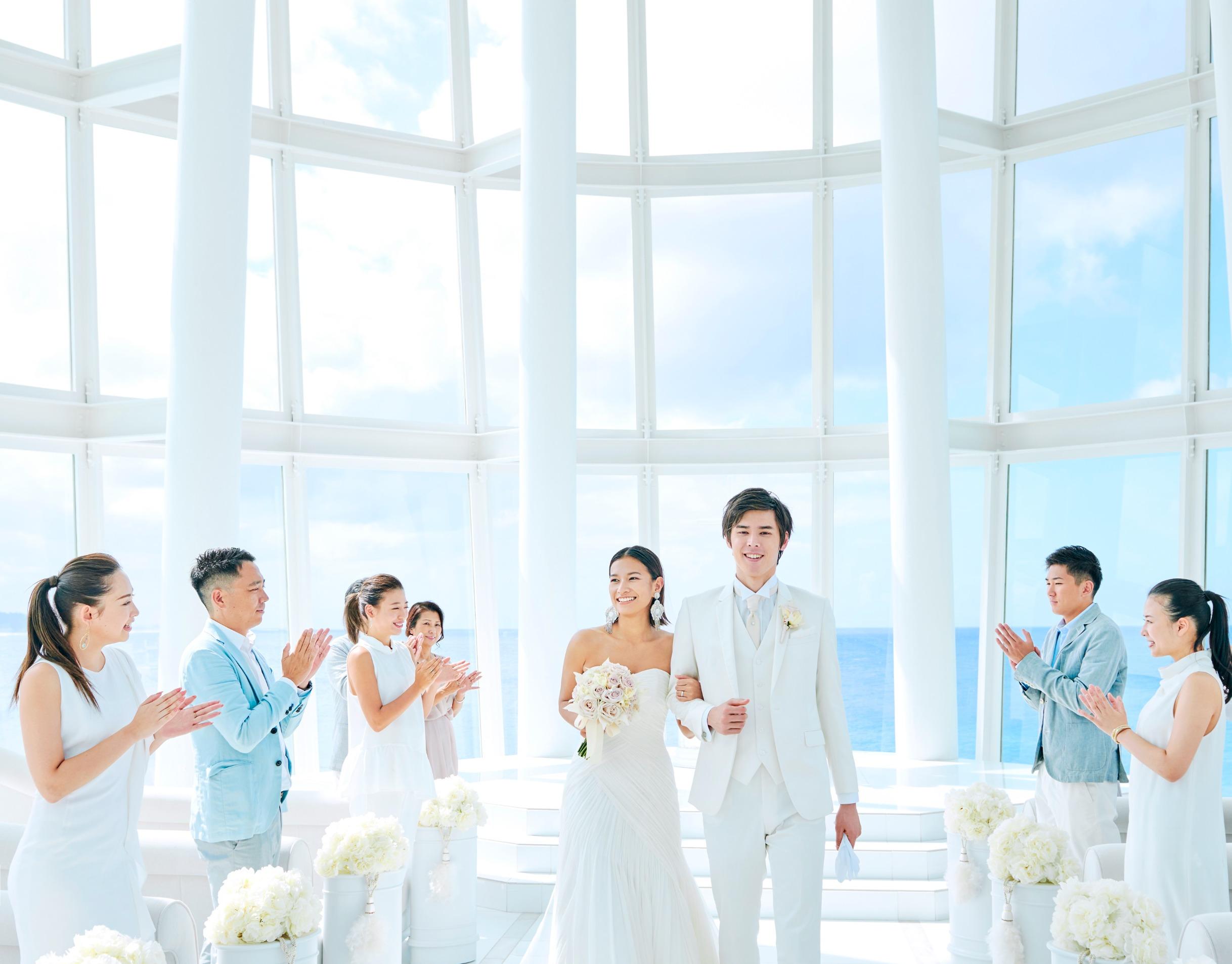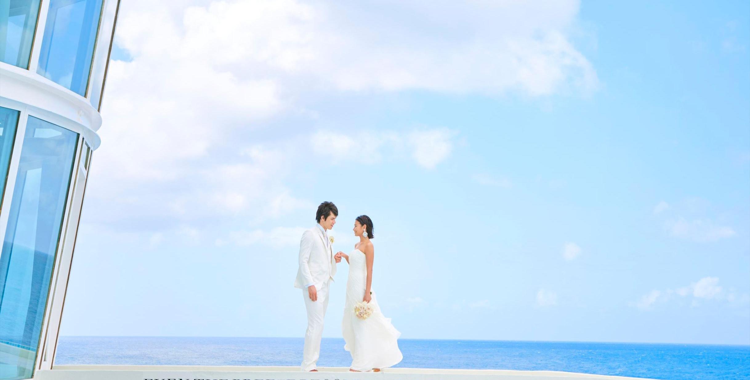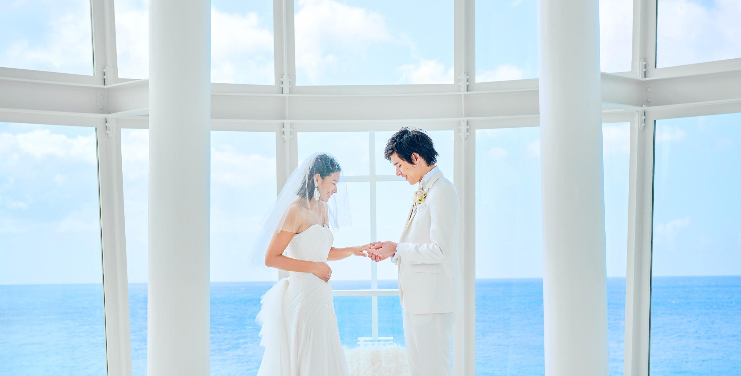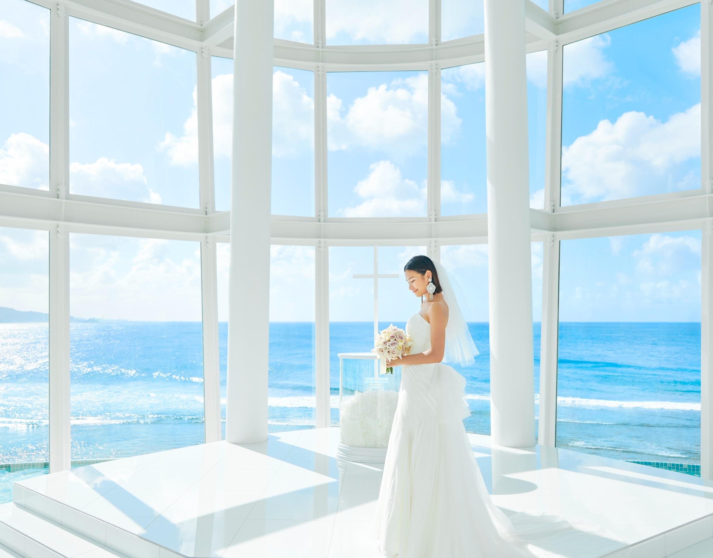 白と青のコントラストが描く光景に心を奪われる。青い海と空を感じながら祝福のときを迎えて。